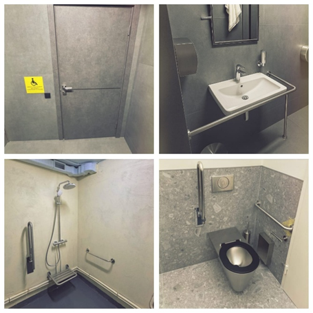 Порушення: відсутні, невірно розташовані або влаштовані не в повному обсязі поручні біля унітаза та умивальника. Вони залишаються недоступними, хоча й мають відповідне позначення.